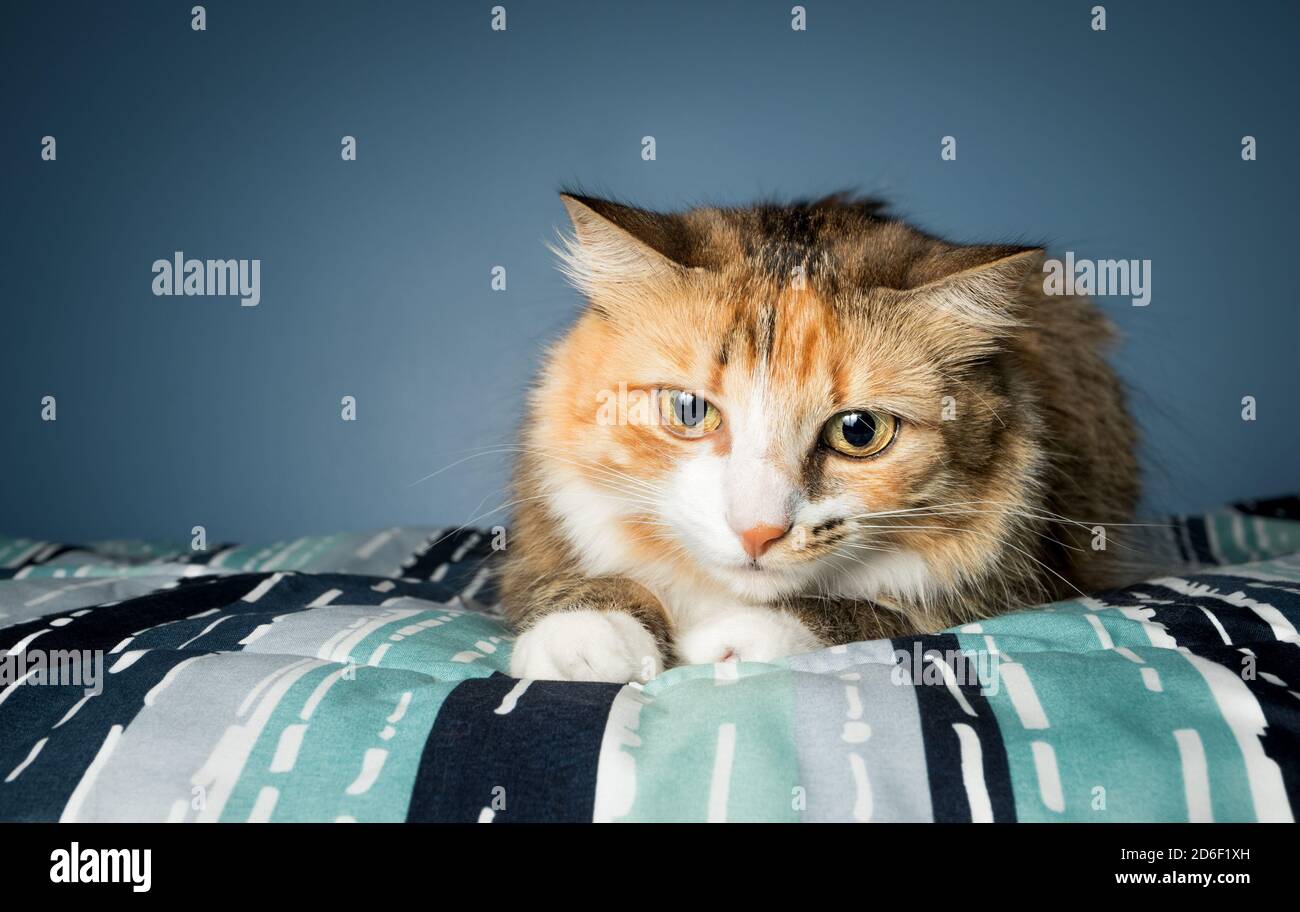Cat Ready To Pounce With Dilated Fixed Pupils Small Female Cat Sitting On The Bed In Hunting Mode Or Waiting For The Toy Selective Focus On Cat Stock Photo Alamy