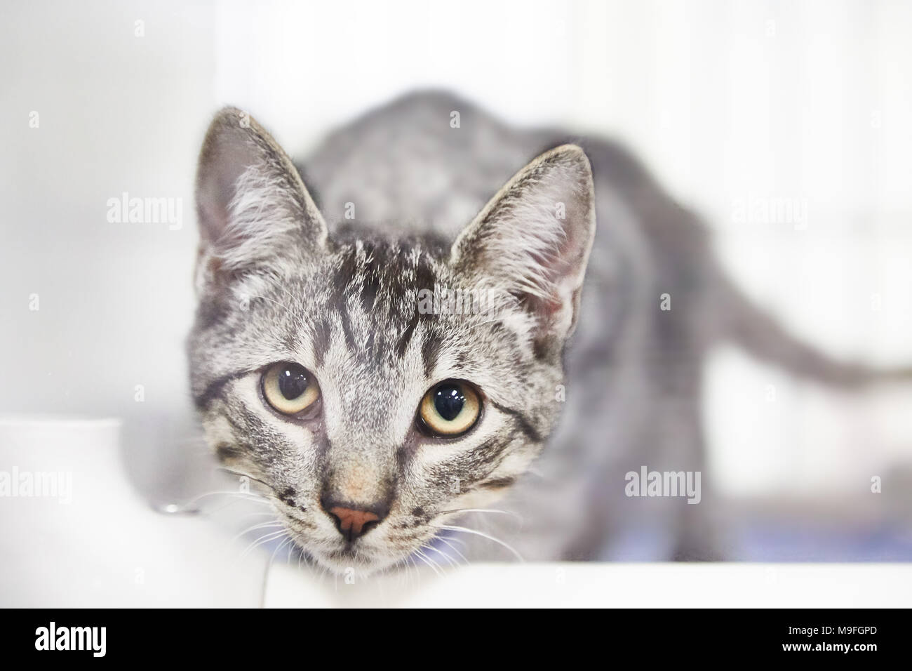 Playful Young Grey Tabby Cat Seeking Attention Looking Up At The Camera With Beseeching Eyes Over A High Key Background Stock Photo Alamy